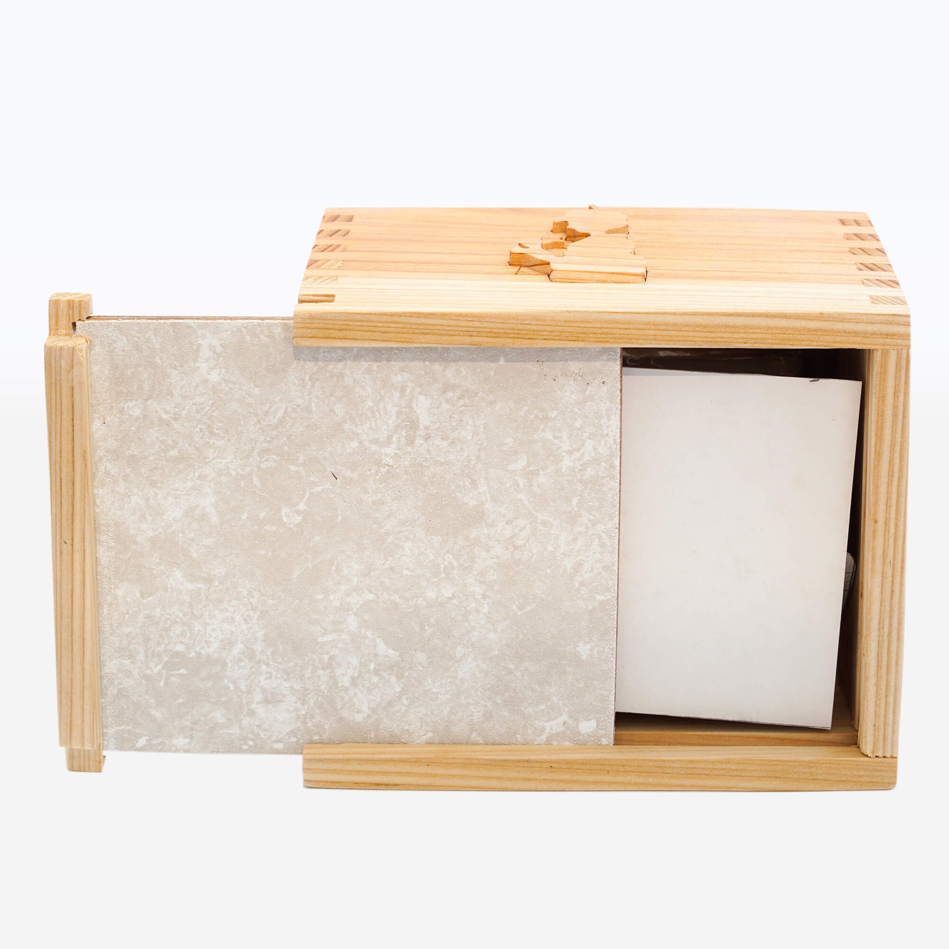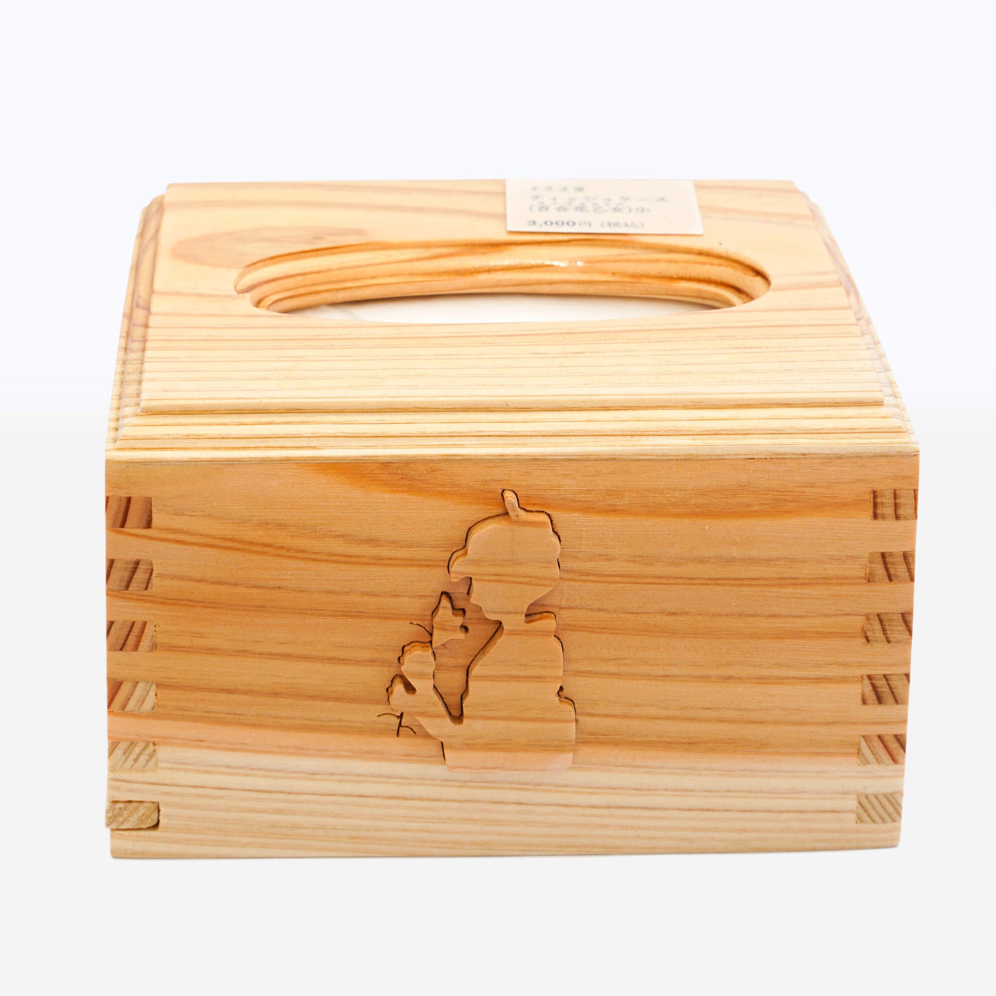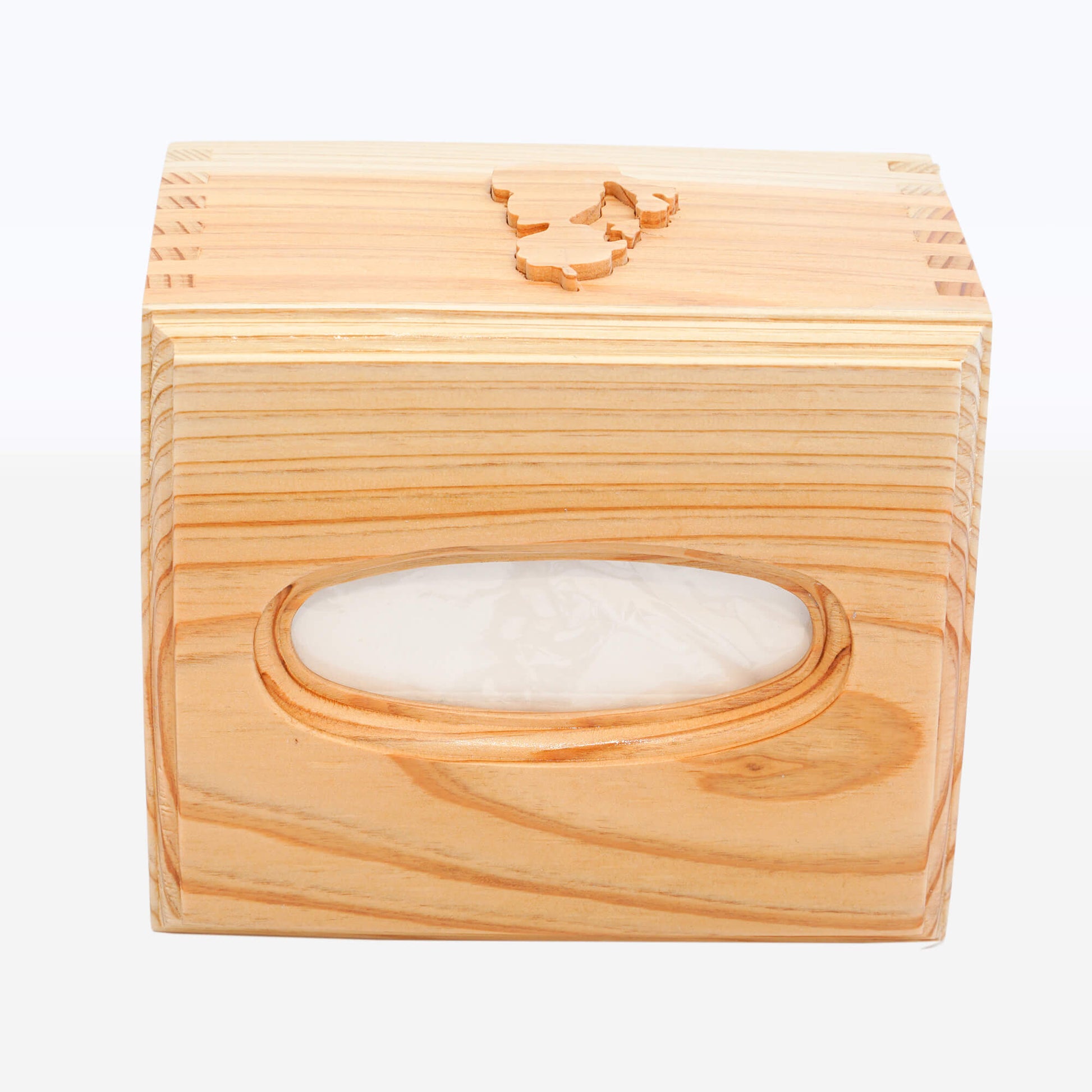 繊細な模様の木工細工の、ポケットティッシュを入れるティッシュケース。底板を横に滑らせて引き出し、ティッシュを入れます。中の底紙がバネ状になっており、最後までティッシュが取り出しやすくなっていま す。
